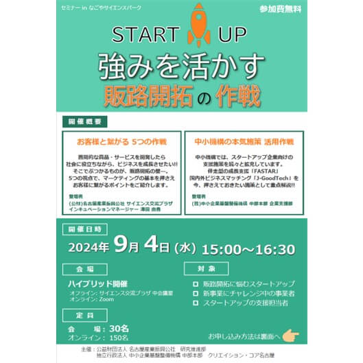 当社のさわゆかがインキュベーションマネージャーを務める(公財)名古屋産業振興公社 サイエンス交流プラザ インキュベータ―ルームでは、(独)中小企業基盤整備機構のインキュベーション施設 クリエイション・コア名古屋と共同開催で、START UP 強みを活かす販路開拓の作戦を開催します。