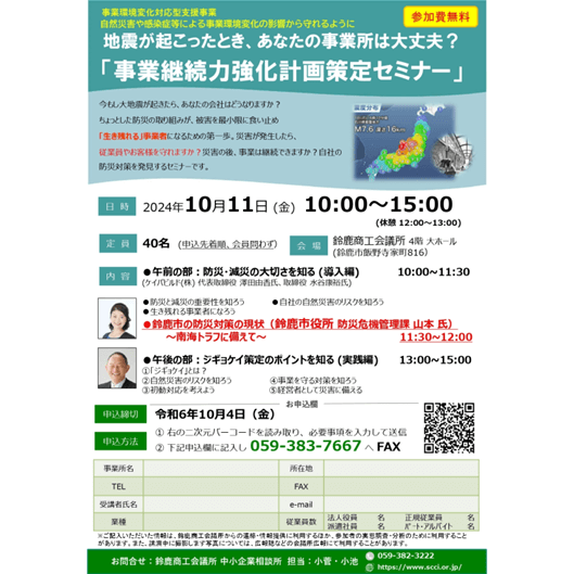 その解決の糸口となる事業継続力強化計画(ジギョケイ)。午前・午後のみっちり4時間セミナーです。鈴鹿市役所の防災危機管理課も交え、自社の防災対策と向き合えるセミナーです。