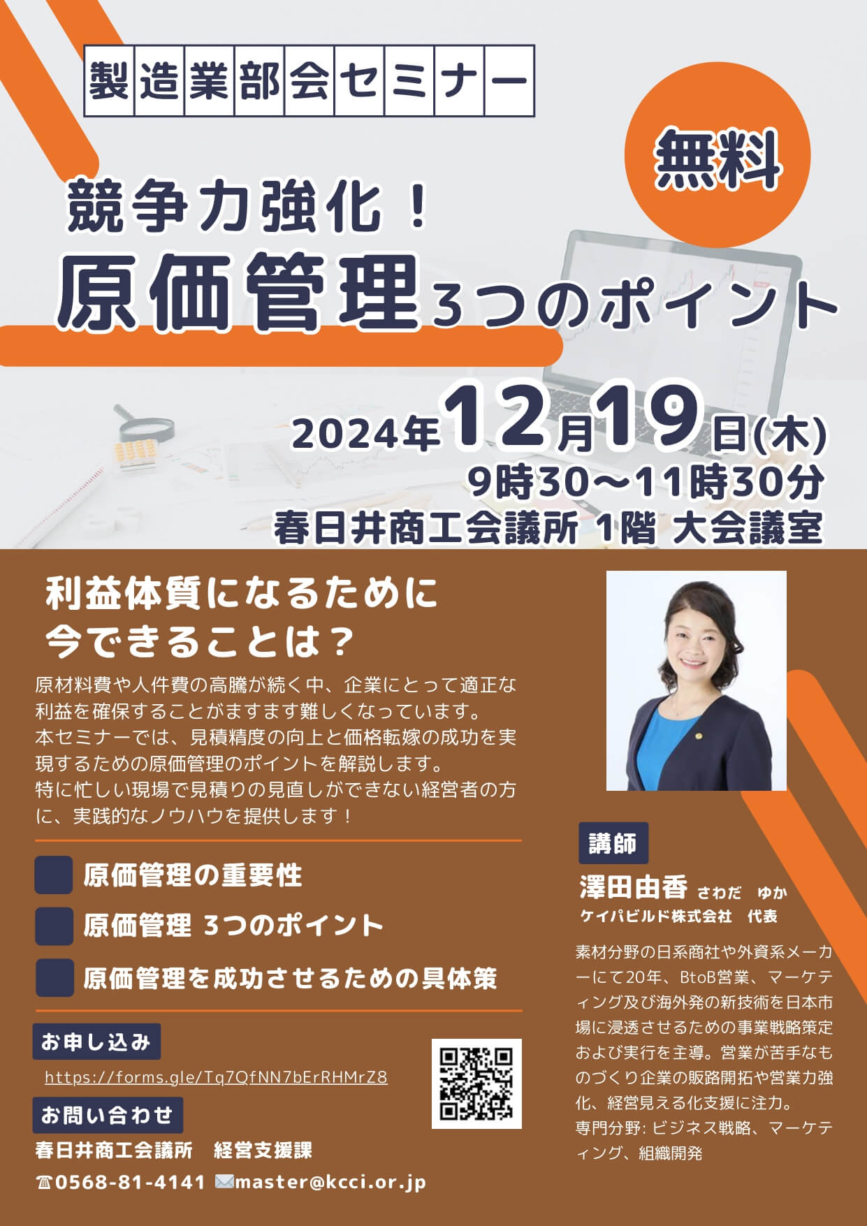 春日井商工会議所 競争力強化! 原価管理 3つのポイント(2024.12.19) 2024.11.5 セミナーのお知らせ 「原価管理 3つのポイント」セミナーに登壇します 当社のさわゆかが春日井商工会議所の製造部会主催のセミナー、「競争力強化! 原価管理 3つのポイント」に登壇します。 価格転嫁が徐々に浸透しつつある昨今ですが、生産コストが不安定な中では原価管理がより重要となります。見積精度を高め、価格転嫁を成功に導くためのポイントを解説します。 是非、ご参加ください!! 日時:2024年12月19日 (木) 9:30~11:30 場所:春日井商工会議所 1階 大会議室 お申込みはこちら 前へ 次へ 記事一覧