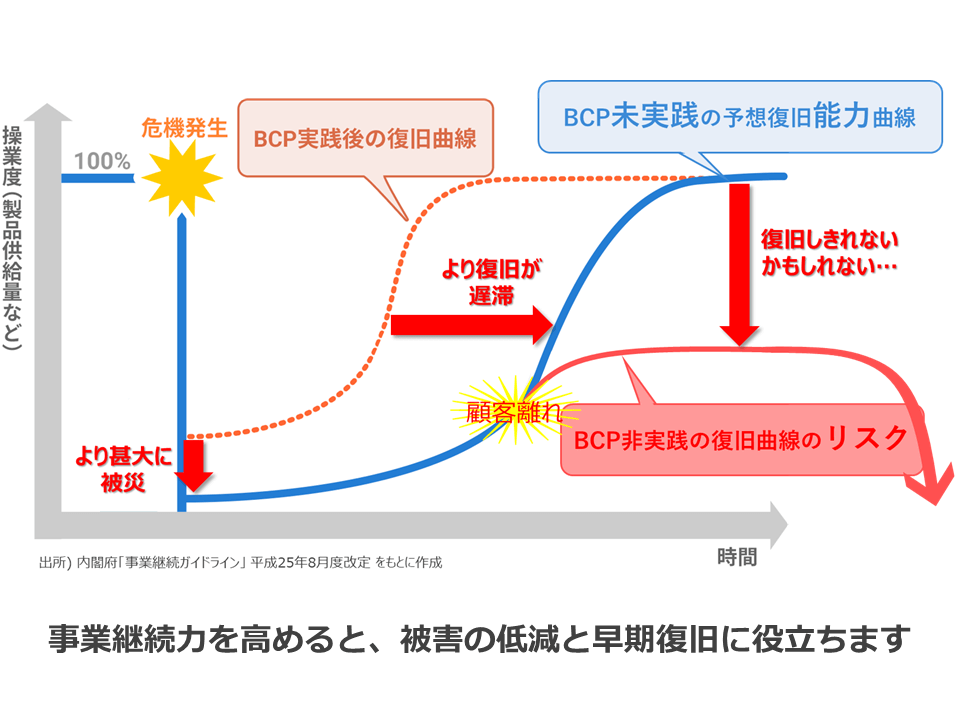災害に備えて防災・減災の対策をしているだけで被害を低減できる可能性が高まります。さらに事業再開の段階でも差が。被害が少ない分だけ早い復旧が可能になります。